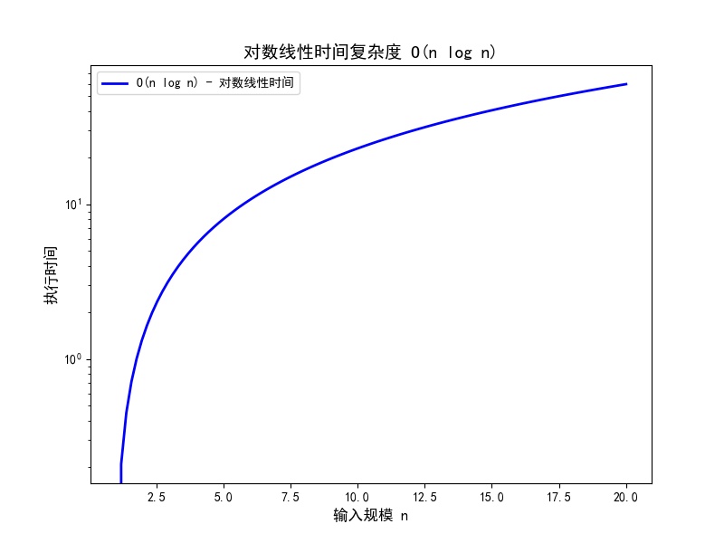 - **O(n log n)**:对数线性时间,常见于高效排序算法,如快速排序、归并排序等。